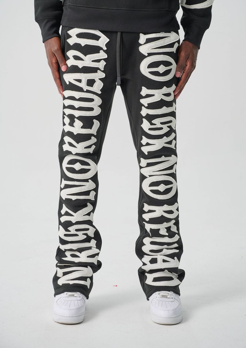 FLEECE FLARE PANTS WITH SELF-FABRIC PATCHES. "NO RISK NO REWARD"